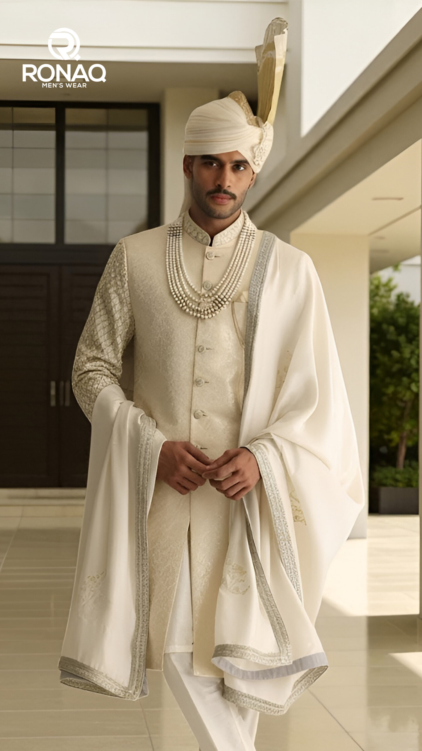 Mughal Style Ivory Sherwani — timeless Mughal motifs and regal ivory tones.